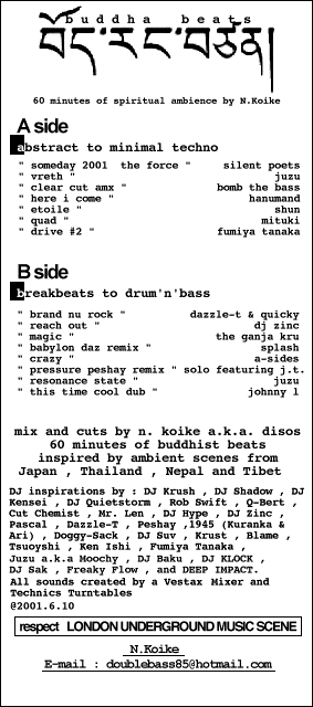 | buddha beatsイベントに来てもらった大学の友達がハードコア・ジャングルみたいなバキバキのアーメン・ブレイクにハマッて、ドラムンベースってカッコイイな〜と思ってくれたので、そのリクエストに応えて作ったテープ。(やっぱパンク野郎もドラムンは好きですね。)B面はどこまでもバキバキな音だけど、A面はあえて自分の最近やってみたかったことを独断と偏見で。ど〜考えてもマニアックな音だけど、どうしてもアブストラクトとミニマル・テクノを混ぜてみたかった。どーも合いますね。やっぱ、アブストラクトとミニマル。一回も音切らずにテンポもガンガン上がって、昇天していくようなミックスにしましたとさ.....。一発、流しで録音したから雑だけど、ライブ感があります。ちなみに、トランスっぽいジャケットにしたけど、あえて精神世界にトリップってことで、タイのアユタヤで撮ってきた写真を使いました。 |