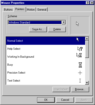 4. Choose the tab that says POINTERS. The first thing you should probably do is click the SAVE AS button and name your new cursor them (pick something like Bone Theme, for example). Now you can get to work changing each of the cursors. Click on the name of the cursor you want to change, then use the BROWSE button at the bottom of the window to search for a new cursor to change it to. Repeat for the rest of the cursors you wish to change. Click SAVE AS when you are finished, in order to save your work, and OK when you are done.