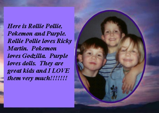 Below is a pic of me and my kids. They picked their own nicknames. Rollie Pollie is the first boy, in the middle is Pokemon and the girl is Purple.