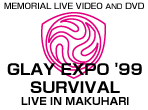 | 2000.7.31 : Release of Live Video - GLAY EXPO '99 SURVIVAL ~Live in Makuhari~. Cost : 5600 Yen Codes : Video ~ PCVE-51002 (limited editon of 200,000 copies) DVD ~ PCBE-50029 *It comes with a Memorial Photobook for initial reservations. There are 23 songs in this video : 1. HAPPY SWING 2. Kuchibiru 3. Glorious 4. SHUTTER SPEEDS NO TEEMA 5. More than Love 6. SURVIVAL 7. Ikiteku Tsuyosa 8. Yes, Summerdays 9. summer FM 10. INNOCENCE 11. Freeze My Love 12. HOWEVER 13. Koko Dewa Nai, Doko Ka E 14. LADY CLOSE 15. TWO BELL SILENCE 16. MISERY 17. Yuuwaku 18. COME ON!! 19. ACID HEAD 20. I'm in Love 21. Kanojo No "Modern..." 22. Biri Biri Crushmen 23. BURST *Fans who buy both VIDEO GLAY 4 and this video will get a chance to obtain GLAY presents (not for sale) when they send their stubs back. Please note that the first press item of the the Makuhari Messe Memorial Photobook is not related to this. So, fans who did not buy VIDEO GLAY 4 would still be entitled to the Memorial Photobook if they bought a first press release Makuhari Messe Expo '99 SURVIVAL video. *Sorry about the earlier mistake made. * For more details, check out : http://www.glay.co.jp/makuhari/index.html |