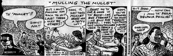 Ah, the mullet, hairstyle loved and cherished by rednecks, wingnuts, and dirteaters everywhere throughout history and for years to come. . . . It is something of an enigma where exactly the mullet originated, but I favor the theory stating that the rednecks were sick of their long-time nickname, so they grew a huuuge neck-flap of hair to protect their necks from the harmful UV rays of the sun - so thier necks would no longer be so red. Either way, this haircut is the warning sign of a real social outcast. If you are lost in the hills of the Midwest, the direction where there are less mullets is NORTH. Remember that.