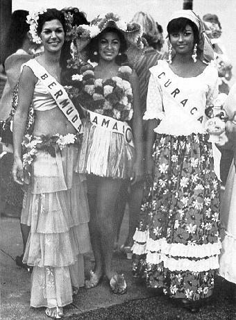Anne Marie in her national costume at the 1968 Miss Universe Pageant. Beside her are Miss Bermuda, Marjorie Bronfield; and Miss Jamaica, Victoria Martin.