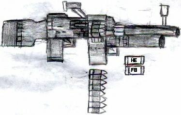This medium machine gun is Heavy Arms choice of weapon in robot mode. When used in assaults against any Predacon BlackOps operation, Heavy Arms usually plays a supporting assault role due to the weight, ammo capacity and sheer firepower. Heavy Arms is not just restricted to the precision of the CovertOps section but also plays a part in overall Maximal assaults due to the power of his weapon. The HE and flashbang grenade launcher can fire grenades up to 1 click away with extreme accuracy. The machine gun itself has a lot of recoil due to the 1000 rpm rate of fire but this is minimized by Heavy Arms's strength and stability.