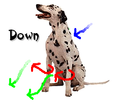 When you start teaching "down", you should always start in the sitting position. Wrap one arm around the dog's body and grasp it's right wrist. Always grab the wrist, not the paw. You will have more control. Use the other hand to grasp it's left wrist. Lift both feet an inch or two off the ground (red) and slide the dog down by pulling it's arms forward (green). Use your left arm to press the dog's body towards the ground while doing this. Remember to use a short, simple command, like "Down." Reward your dog once it lays down, and stays in that position for 5 seconds.