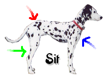 To make your dog sit from a standing position, place your left hand (red) on the dog's chest, and your right hand (blue) on it's tailbone. Push on the chest with your left hand, and push the dog's rear down with your right. While doing this, the back legs (green) should be bending, eventually putting the dog into a sitting position. Remember to say a short, simple command, like "Sit", while doing this. Reward your dog once it sits, and stays in that position for 5 seconds.