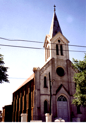 En este terreno reservado, durante la colonización, para la construcción de la iglesa, en 1887 fue emplazada una gran cuz de madera, que reunió a los colonos durante los primeros años. En 1889 se finalizan las obras de la primer capilla, y en 1917 se terminan las obras de la actual iglesia. Esta se construyó dejando adentro a la capilla. Una vez terminada la iglesia se procedió a demoler la capilla. De esta manera se perdieron la menor cantidad de días de servicios religiosos, de tal forma de aprovechar todas las venidas del Padre Luis Servet. El Padre Servet, venía desde la Colonia Hinojo a realizar oficios en las 3 colonias de Coronel Suárez.