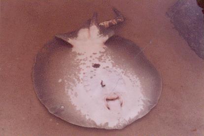 A curious electric(?) or poisonous ray that grabbed our hook left in the Caroni River one night while we slept. Don Fulgencio, a denizen of the wilds along the Caroni, would only laugh when we asked about the sting and said he would eat it after we left. This I don't doubt as I saw him eat armadillo and chiwiri the worlds largest rodent. [jpg-13441k]
