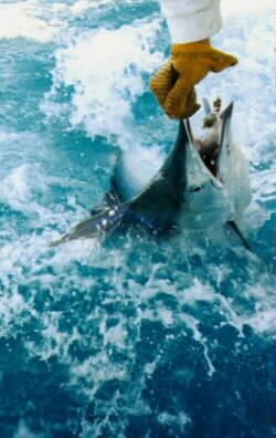 releasing a small black marlin