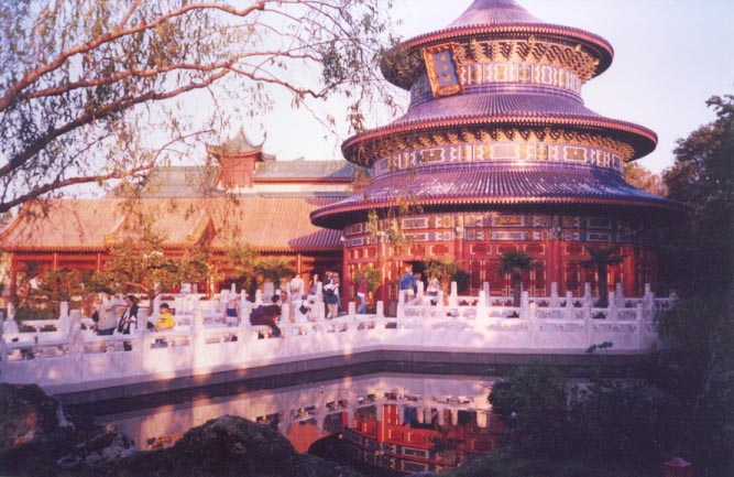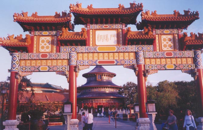 The beautiful serenity of China comes to America in Epcot's China pavilion. Everything from the traditional Chinese music playing over the sound system to the beautiful landscaping conspire to create a peaceful and calming atmosphere. After passing through the graceful Ceremonial Gate of the Golden Sun at the entrance, guests first see a stunningly-detailed replica of the Hall of Prayer for Good Harvest, built in Beijing during the Ming Dynasty. The main attraction in China is a 360° film called Wonders of China: Land of Beauty, Land of Time. This 19-minute film shows many awe-inspiring sites in China, including the enchanting Shilin Stone Forest, the majestic Forbidden City, the wondrous Great Wall of China, the vast expanse of Mongolia, and much, much, more. The only shop at the China pavilion is a large emporium called Yong Fen Shangdian. It sells clothing, prints, tea, toys, trinkets, antiques, and so much more. The restaurants in the China pavilion are the Lotus Blossom Café, and Nine Dragons. They serve a wide assortment of Chinese cuisine.