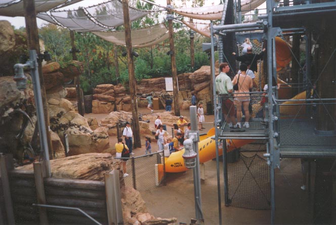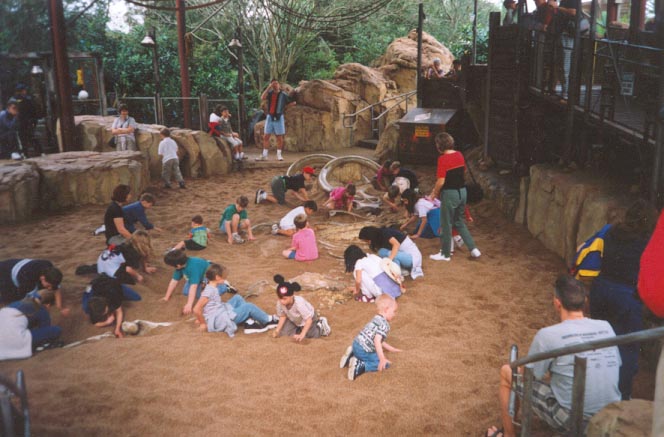 Disguised as a paleontogolical dig site, The Boneyard is an ingeniously-themed playground which is perfect for letting kids burn off energy. As guests enter the area, they find themselves on a metal structure fun to climb and functional as a lookout to view the many dinosaur skeletons sticking out from the surrounding rocks. The ground is strewn with dinosaur footprints, and if guests step in one, a large roar will sound. Some of the other activities in this area include slides and caves, but by far the biggest and most popular attraction in The Boneyard lies across the Olden Gate bridge, which passes under a huge dinosaur skeleton. There guests will find a large sandpit just right for digging. As the sand is pushed aside, ancient bones begin to appear, and as digging continues, a full skeleton begins to materialize in the sand. Digging for bones turns out to be rather fun, and if you spend enough time, you might recognize the skeleton as a wooly mammoth.