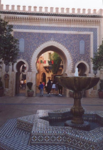 Inspired by both old and new Moroccan cities, this pavilion is a beautiful reproduction. With spacious courtyards, narrow winding streets, intricate architecture, and trickling fountains, the Moroccan pavilion will take guests to a far off place. The intricate tile work, mosaics, and carved plaster make this one of the most detailed World Showcase pavilions. Even though there are no real attractions at this pavilion, it's still fun to explore the interesting shops lining the narrow shaded streets. The shops include Casablanca Carpets, Tangier Traders, the Brass Bazaar, Berber Oasis, Medina Arts, and Marketplace in the Medina. They sell beautiful rugs and carpets, leather goods, fezzes, baskets, brass pots, merchandise from the movie Aladdin, etc. Since this is the only World Showcase pavilion to be sponsored by the country portrayed, it has a Moroccan tourist office, where you can find out about, or even book, a trip to the real Morocco. The only restaurant at this pavilion is Marrakesh, and it serves lamb, chicken, couscous,etc