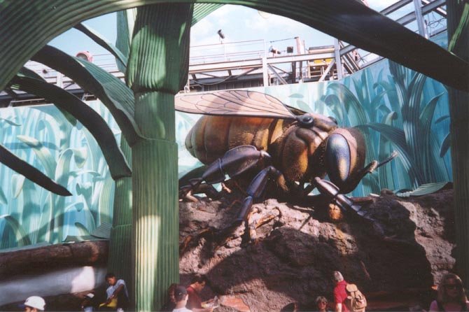 The Honey, I Shrunk the Kids Movie Set Adventure offers alot of shrunken excitment, and is especially popular with young children. Based on the backyard adventure of the 1989 film, Honey, I Shrunk the Kids, this area has 30 foot high blades of grass and a soft, almost carpet-like ground. Throughout tha area are many fun objects good for climbing and sliding such as huge spider-web nets, an enormous old tree stump, a discarded film canister, Lego blocks, and even a monstrous ant! There is also a garden hose that continuously spurts water and a huge dog's nose that sniffs anybody that walks by. So, for the young and the young at heart, this is a great place to blow off steam.