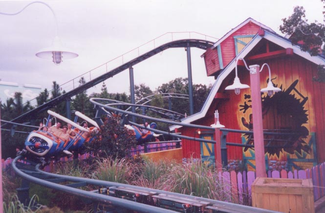 along the way. We were dissapointed to find that they don't sell the scrumptious " Make Your Own Strawberry Shortcake" in Toontwon anymore. So, we did the Barnstormer, then took the train to Main Street and hopped on the monorail to Epcot. On arrival, I was thrilled to see that they had taken the boards away from the entrance to Test Track. A Cast Member said that it may be opening to guests at 6:30pm. I was also shocked to hear from the Cast Member that they couldn't run the ride in the rain, because it greatly increases the car's stopping distances! I prayed for it not to rain, and planned to get in line by 5:00. Meanwhile, we went on Horizons, twice! I forgot how
