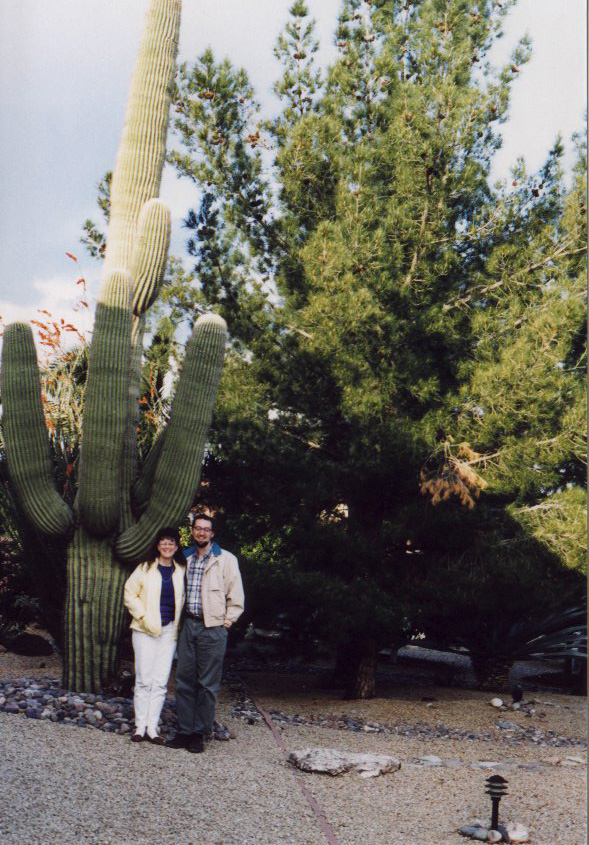 The famous Sagura (pronounced sah-WEAR-ah) cactus. These giants appear all around the Phoenix area. This was taken in the back yard of Barbara's mother's friends. No need for a lawnmower!