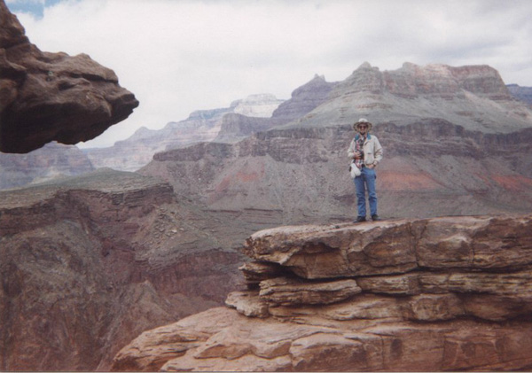 Here I am at Plateau Point, Grand Canyon! I'm standing on a pinnacle down in the canyon. The mules are parked about 20 yards behind the camera. If I were to take two giant steps backward, I would fall about 200 feet down to the raging Colorado River. I felt like I was on top of the world!