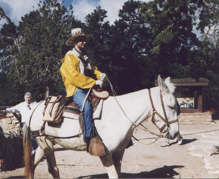 Here I am, first getting to know my trusty mule. Make no mistake - this is not a donkey! These things are bigger than the average horse. At this point, I was trying to figure out how I was going to manage a canteen, a camcorder, a waterproof camera, and mule reigns, all with gloves on.