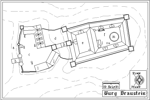 die Vorburg.Es ist eine alte Tradition, die immer große Scharen von Besuchern anlockt, daß zum Drausteiner Jahrmarkt (1.Peraine) die jungen Mädchen und Burschen ihr Halstuch in den Zwinger fallen lassen, um zu sehen ob sich ein Verehrer oder eine Verehrerin findet, der oder die sich das Stück heraufholt. Der Baron läßt den Bären am Morgen dieses Tages stets kräftig füttern, damit keinem seiner Untertanen etwas geschehe, dennoch ist uns aus früheren Zeiten Kunde von so manchem Unfall überliefert: Der alte Küfer Jord zeigt heute noch stolz sein Holzbein - das echte mußte er als Jüngling beim Bären lassen.