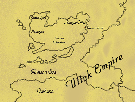 Eventually, two rude kingdoms rose on the continent of Aequeter. Grande Chernieve occupied the broad plains at the continent's center, and it still derives great riches from the fertile fields. Avendyne came to occupy the hillier lands to the west, and its brave cavaliers were able both to stave off Grande Chernieve's armies and subdue the mountain clans of Cullinclyde. The cities of the east coast, long independent, have formed a league led by the city of Hemmerstadt, and the islanders off the south coast of Aequeter have rebuilt their crumbled monuments of marble to claim direct descent from the fallen empire.