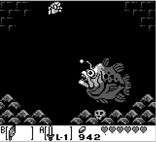 Using your sword,bombs or arrows,hit the angler fish's antenna ball as many times as you can.If you're fast enough, you'll fry the fish before it has a chance to cause an under-water avalanche when it charges the left wall. |