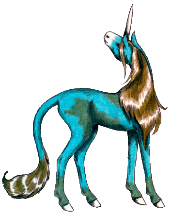 You top a rise and see an aqua stallion with green markings and a dark golden mane. He is looking over his shoulder at something, but you can't tell what.