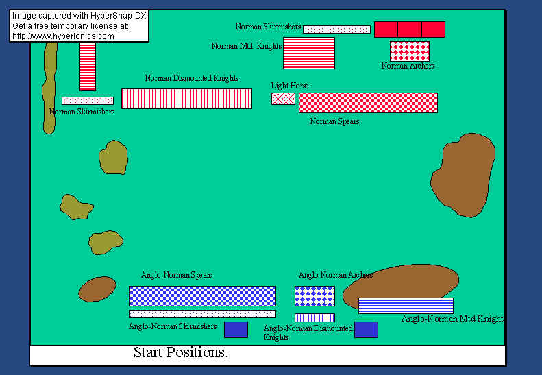 The battle opened with an advance by the Norman dismounted Knights. Further to their right the Norman skirmishers picked their way through the broken ground; no doubt expecting to find either English or Welsh psiloi waiting in ambush. Behind these came a group of Norman Knights who were determined to fight this battle on horse back.