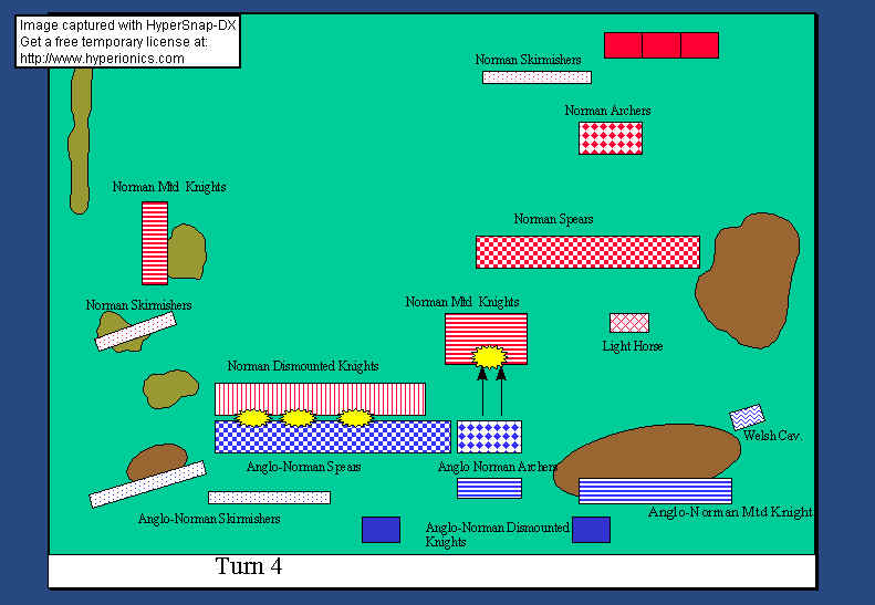 By turn 4 the clash of shields reverberated around the battlefield as the dismounted Normans crashed into the Malitia spearmen. The Norman right flank was finding the rough ground to their front heavy going, (thanks to a shortage of pips). At the same time Welsh arrows from my CinC’s command started to find targets in the ranks of William’s knights, resulting in a couple of recoils and one element being destroyed. The Welsh Marcher Muntatores moved off the high ground to slow up the advance of the Norman spears. "Where is the Prince, and where are the Welsh; I need them here now!" ranted the Anglo-Norman King. "The Norman dogs are well committed. If my flank marches arrive now he is surely doomed!