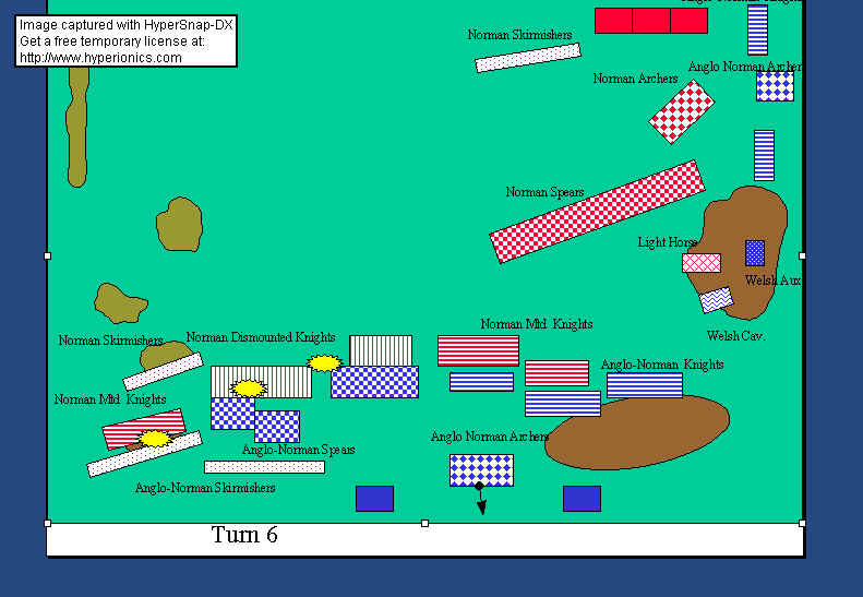 "Look Sire! There on the right; dust in the distance!" At the start of turn 5 a "6" on the Prince's pip dice revealed that he would arrive at the start of the next turn. With that news the Norman knights behind the archers mounted their steeds and charged through the ranks of the Welsh archers and straight into the knights of William’s command.This move caused the archers to flee to their rear, (as you would if you were just run down by your own knights from behind!!), but it did get them out of harms way! At that same moment the knights on the high ground came surging over the crest and down towards the Normans below. On my left the battle between the Malitia spearmen and dismounted Norman’s see-sawed. Also the Norman’s on my far left had cleared the broken ground and only some English skirmisher’s stood in their way.