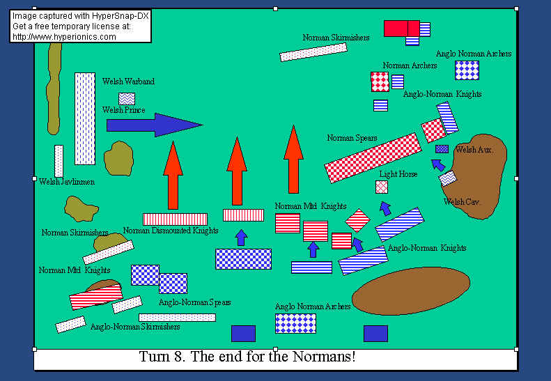 It was at turn 8 that the end came. The dismounted Normans were finally broken as were the knights under William’s control. This coupled with the loss of over half the baggage proved too much for the invaders, and a general rout followed. As the final insult, the unreliable Welsh arrived also to cut off any retreat and finish off any fleeing Normans that didn’t have a horse.