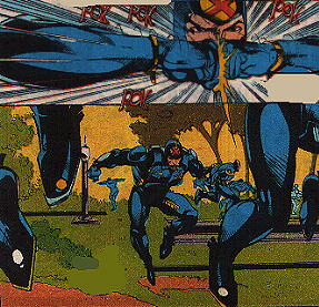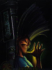 Jamie Madrox, AKA The Multiple Man has one of the more unique powers in the Marvel Universe. Any kinetic impact of sufficient force, i.e. being punched, will create another Madrox. And so on and so forth. As seen to the left, one of his favorite tricks is to punch his hands together many times and go forth and multiply. A nutty prankster who often argues with himself, especially since a near-death experience has him uncertain of his own core personality. By putting a finger under his door, slamming his hand, creating a duplicate, and then re-absorbing it, he claims to be the only man in the world who can chain-lock his apartment when he leaves. A crazyman and then some, that's what you get when you can have fifty or sixty of yourself running around.