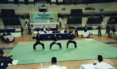 この種目は、ウィラロカ ワジッブと言い、3人で、ある決められた型を披露する種目です。この型は、最近、世界共通の型としてつくられました。