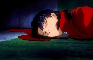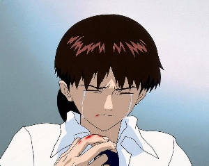 Mientras tanto en el elevador,  Shinji seca sus lágrimas y su boca, notando que está llena con la sangre de Misato y empieza a llorar porque sabe que no estará la próxima vez.
