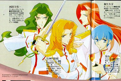 Kyouichi Saionji:The green-haired Student Council vice-president who thinks he is in love with Anthy, although he abused her. Miki Kaoru:The blue-haired youngest Student Council member (7th grade) is a genius that does school work at the college level. He also plays the piano spectacularly, and has a twin sister, Kozue. Juri Arisugawa:The blond 10th high schooler who is also a champion fencer. She doesn't believe in miracles because of a friend who betrayed her trust. Touga Kiryuu:The redhead handsome, playboy, Student Council president. He claims to be Utena's prince, and develops a genuine affection for Utena. table> |