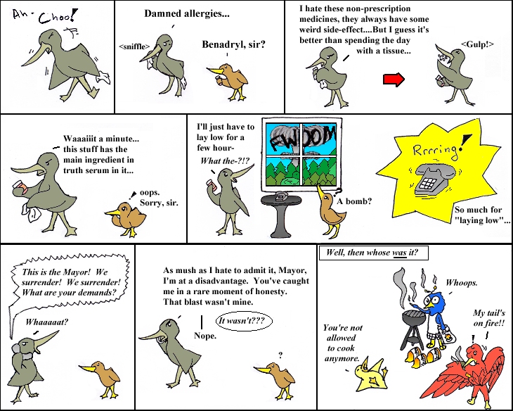 Allergy Season A short one-pager with a villain, a jar of Benadryl, and a bit too much lighter fluid. Very little plot and no catchy title, but it's funny.