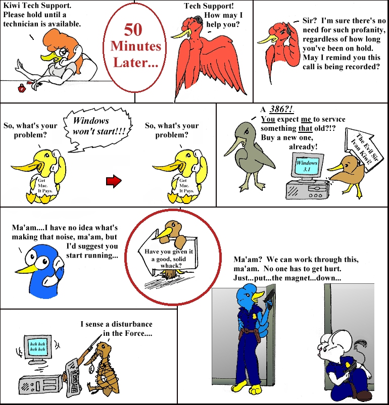 Kiwi Tech Support A short one-page comic featuring Bob Kiwi & Co. hard at work as computer technicians. (Evidently Ferdia and Squeaks are moonlighting this and policework.) It's short, and it's got a heat-packin' keyboard.