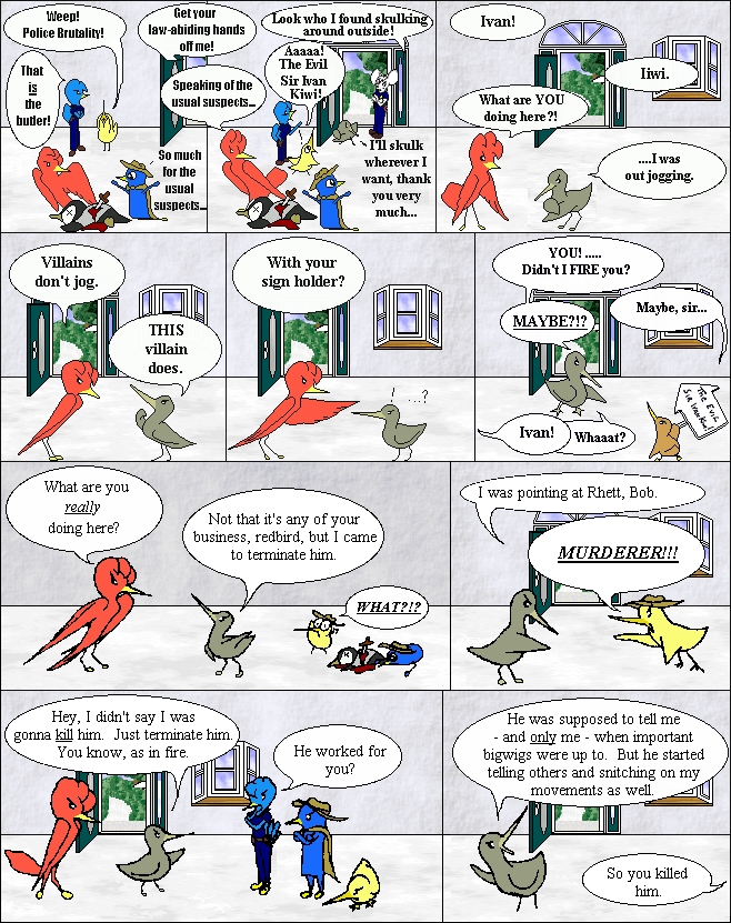 Part 1 Part 2 Part 3 Part 4 Bob Kiwi: Private Eye Complete Script (text version) Comic Page 1 Comic Page 2 Raft Panel Mwahahahahaha!!!!! I've finished the script!!! Ahahahahahaaa!!!!!.....um, anyway.....I've finally posted the HTML version of the complete script. I have changed some parts in it from the text version, so just read the HTML one, okay? I'll post the text when I've updated it.