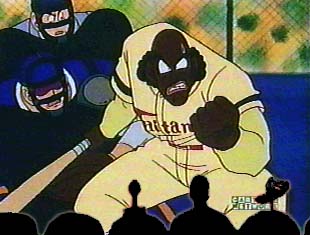 (Lots of dust-filled scenes of players choking and pounding each other. The crowd cheers. Yamcha is still kneeling in the on-deck circle when a can comes out of the mass of fighting players--)