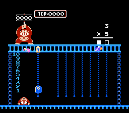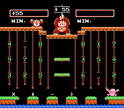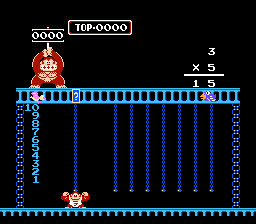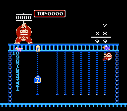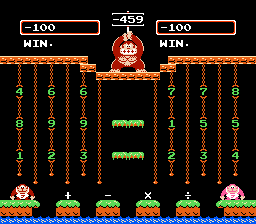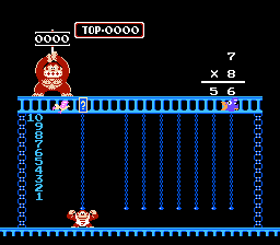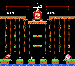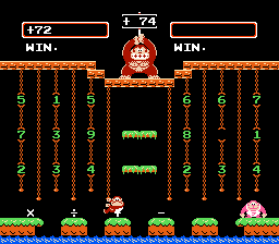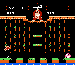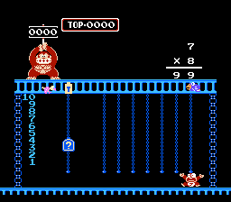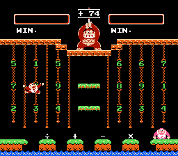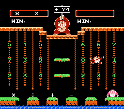 Both Calculate A and B were designed to be played by 2 players, hence DK Jr.'s gay cousin, Flamey Kong, appears over on the lower right hand corner. But 1 player can have just as much fun learning by playing alone as opposed to competing with someone and having them win because they're older and know what the division sign is for and you throwing a tantrum and having violence ensue. Or, not. I've never met anyone who has ever owned this game or would be willing to fess up to it. In both Calculate modes, good old Donkey Kong stands atop the jungle, holding up the target number. And you have to grab numbers and mathematical signs in an attempt to match that number. And because I rock as hard as I do, I'm going to provide a walkthrough for this particular number...