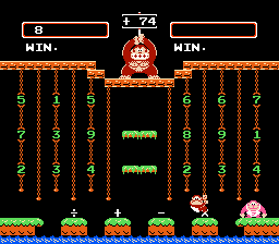 First, grab the "8" in the center of the left side. Then go for the "X" symbol. That means the next number you get will be multiplied by the "8" you just picked up. Now go for either "9" on the screen. Wowee! You've got 72! Only 2 away from the magic 74! Now you need to find a "+" sign, and then a "2", and you'll have 74! Honestly, I don't know why this wasn't rerelased in 1993 alongside Zelda, Zelda 2, Punch-Out, and Metroid. This clearly improved my ability to recognize the number 74 and should have been shared with the next generation of NES fans, all of which purchased top-loaders that same year. Except of course, nobody purchased top-loaders aside from the people who originaly had NESes back in the 80s. And even WE didn't do it until 5 years or so after the fact. Ok...moving on...