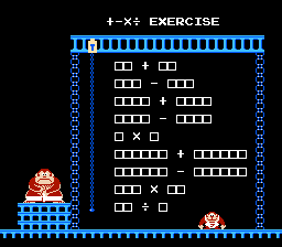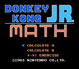 Donkey Kong Jr. Math. The ONLY NES game to bear the seal of the "Educational Series" of early NES releases. Probably more so that the NES would actually sell in its early days as opposed to an excuse to make ANOTHER Donkey Kong game, DKJr. Math was released much to the delight of parents everywhere because, why should you even play video games if you don't learn from them? Fortunately, this was the LAST educational title released for the NES (until of course those demons at Fisher Price and Hi-Tech Expressions stepped in) because it was proven that you DO learn a lot from video games: Donkey Kong and all of the barrel-jumping, girder-climbing craziness within helped kids hone their hand-eye coordination, Rad Racer taught us that you CAN survive a 255 km/h (roughly 190-200 mph) crash, and, among other things, Spy Vs. Spy taught us that it's ok if blacks and whites don't get along so long as they use bombs and spring-loaded booby-traps in their battles instead of guns and actual physical violence. So, in the time-honored tradition (yes, even in 1984, some traditions were "time-honored", this wasn't the just-invented advertising ploy that's selling Game Boy Color remakes of NES games) of kids learning through video games, Nintendo, and in turn, Kid-Niki presents...
