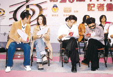 港 台 舉 行 的 《 第 二 十 屆 十 大 中 文 金 曲 》 記 者 會 每 次 都 搞 搞 新 意 思 ﹐ 對 上 一 次 於 記 者 會 中 紅 星 坐 正 中 的 位 置 ﹐ 二 、 三 級 星 及 新 人 坐 側 面 位 ﹐ 事 後 被 指 「 大 細 超 」 。 至 於 昨 天 於 港 台 舉 行 的 記 者 會 中 ﹐ 就 刻 意 安 排 「 好 朋 友 」 及 一 些 「 親 密 戰 友 」 排 排 坐 ﹐ 從 而 製 造 話 題 ﹐ 例 如 鄭 秀 文 與 許 志 安 ﹔ 梁 漢 文 與 楊 千 嬅 ﹔ 東 東 則 與 霆 鋒 一 起 坐 ﹐ 而 鄭 伊 健 、 彭 羚 、 陳 慧 琳 、 蘇 永 康 、 陳 潔 儀 、 鄭 中 基 就 置 身 事 外 ﹐ 一 於 不 關 他 們 事 。