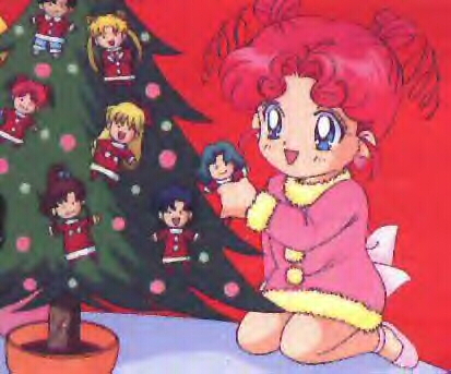 Chibi-Chibi hanging Senshi ornaments on a Christmas Tree.