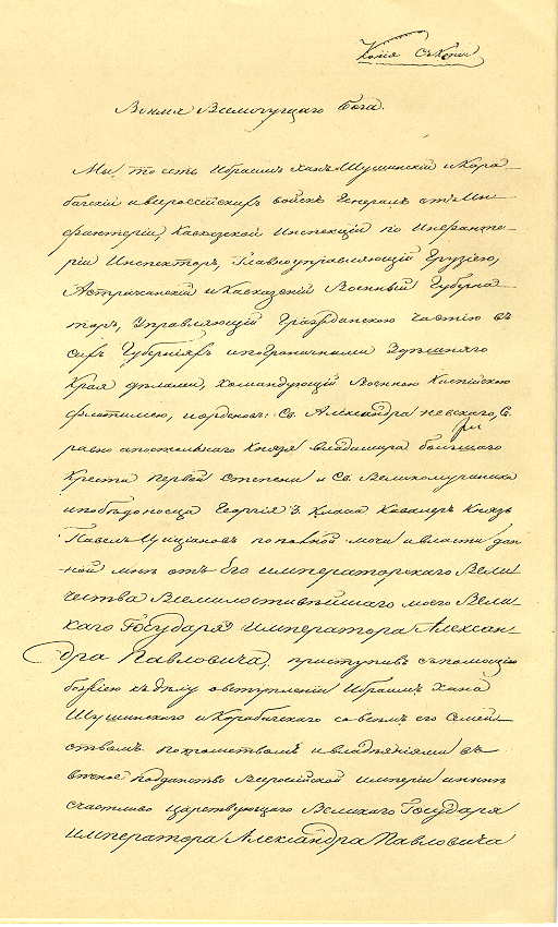We, Ibrahim Khan of Shusha and Qarabagh and the General of Infantry of All Russia’s Troops, Caucasian Inspection on Infantry and others, Prince Pavel Tsitsianov with the full power given to me by His Emperor’s Highness The Dearest and Greatest Sir Emperor Alexander Pavlovich took up with the help of God the matter of granting everlasting citizenship of All-Russian Empire to Ibrahim Khan of Shusha and Qarabagh with all family, posterity and possessions of his.