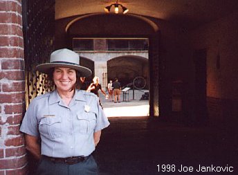 Maureen was on the staff when I worked at the fort. She actually remembered me from more than a dozen years ago when I recently returned there. Maureen was kind enough to let me bring my bike into the fort while I took the pictures on these pages. She's standing at the entrance to Ft. Point shortly before closing time. |