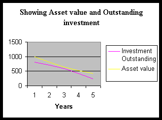 The lessor maintains his title over the asset which acts as a powerful collateral for him. Repossession of leased assets is more simple than of assets secured against a loan. Besides, the worth of the security is usually more than the amount of investment outstanding, and as the repayment period is shorter than the life of the asset, the gap between the asset value and the investment outstanding widens over period - see accompanying chart for illustration. Hence, a lessor becomes increasingly more secured as the lease matures.