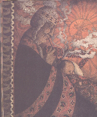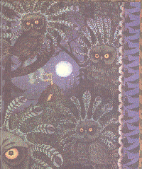 Now, to that smorgasbord, is added another 'Hiawatha's Childhood', this version a Greenaway Medal winner, (1984). Published by Faber and Faber, it is presented in picture-story book form, illustrated by Errol Le Cain, a Hong Kong expatriot resident in Britain but gaining international accreditation. Not for Le Cain the lightweight illustrations prevalent in Reading Scheme Primers; not for Faber the 'translation' for kiddies, the talking down or compromise or structured vocabulary. Instead, Longfellow's original, unadulterated, alliterative verses are presented in sizeable slabs of 3mm. print, attractively yet firmly bordered off from the pictures so that young readers can concentrate on the one or the other. The artwork would appear to have borrowed from Middle Age manuscript illumination, if that artform can be imagined executed in 'Red Indian' style. Pages are richly edged and embellished in intricate earth-coloured motifs ever suggestive of the underlying, ancient culture.