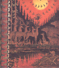 This Hiawatha is not your average 'Noble Savage'. Presented first as a swaddled, diminutive infant dwarfed by the magnitude of fir-forest and mountain, he grows, both in stature and wisdom as the book progresses, conquering his own Wild Things, until, at the end he rides the reindeer under the satisfied, benevolent smile of Nokomis, she as weatherbeaten as an ancient rock, as dignified and stately as tbe princess of an ancient race.