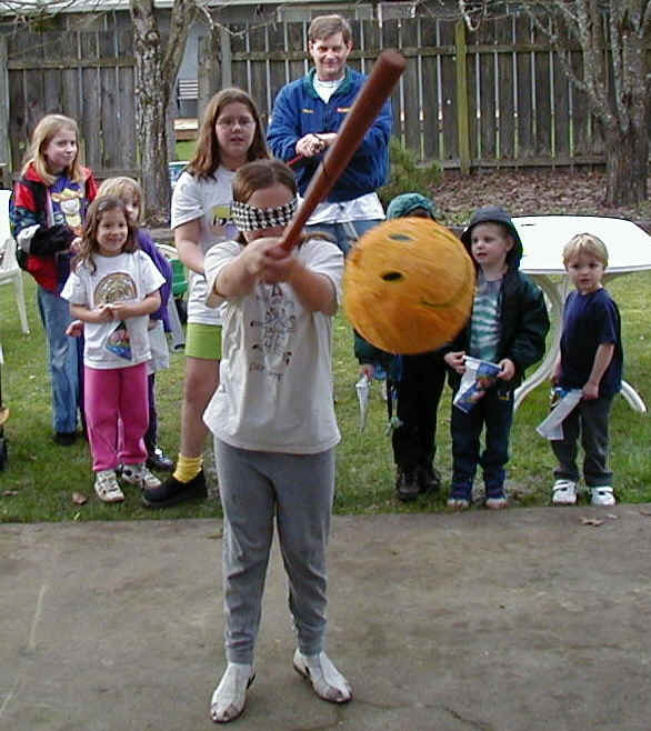 We had a pinata at my party. Kelsey tried really hard. The other kids were: Angie, Julie, Christina, Katie, Zack (behind the pinata), me (B.J.) and Chris.