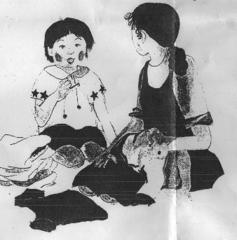 これを子どもに読ませた後,まず,登場人物の整理として,誰が出てくるかという質問をし,「あいちゃん,えりちゃん,春ちゃん,エミちゃん,おかあさん」と黒板に貼った.次に,1番目の絵のなかでえりちゃんはどれか?という質問をした.これは一番右側のこどもだ.2番目の絵に出てくるから明確である.次にあいちゃんはどれか?ときいたら,多くの子ども達が,一番左だといった.先生はこれにたいして,「どうかなあ,他の3人はどれがどれかわからへんのとちがうかな?」といった.確かにそうだ.主旨としてはそうだと思う.私も先生は正しいと思う.でも,子ども達は直感的にこの絵をみて一番左があいちゃんだと思った.この時点で子ども達は,この文章をみて,あいちゃんのイメージをかなりふくらませていたことになる.先生が思っているより,子ども達は鋭くこの話を受け止めたのだ.
