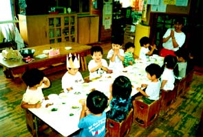 | Children like cooking. They're cooking curry, singing the curry making song. | One peals the onion, and one take beans from the shell. |
