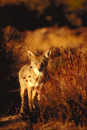The photo ot this hungry coyote was taken in 1996 at Joshua Tree National Park in California. The Camera was a Canon EOS 620 and a Canon 300mm Lens. The evening light was exquisite.